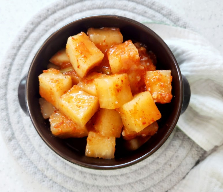 Pindahkan Kkakdugi yang sudah jadi ke dalam wadah kedap udara. Biarkan pada suhu ruang selama setengah hari agar sedikit terfermentasi dan mengembangkan rasa khasnya yang segar dan sedikit pedas. Setelah itu, simpan di lemari es khusus kimchi agar tetap dingin dan nikmati rasa lezatnya. Enak dimakan langsung atau setelah sedikit difermentasi!