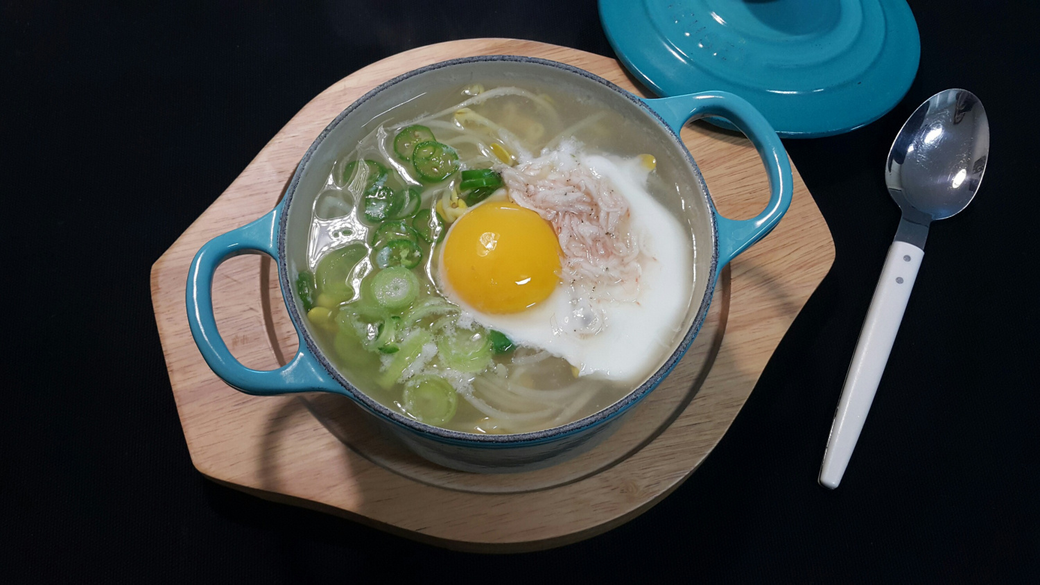Letakkan ttukbaegi di atas kompor dengan api sedang dan didihkan perlahan. Segera setelah mulai mendidih, matikan api. Hindari merebus terlalu lama agar telur tidak matang berlebihan! Nikmati Kongnamul Gukbap yang pedas dan menyegarkan ini selagi panas untuk pengalaman terbaik. Selamat menikmati hidangan Anda!