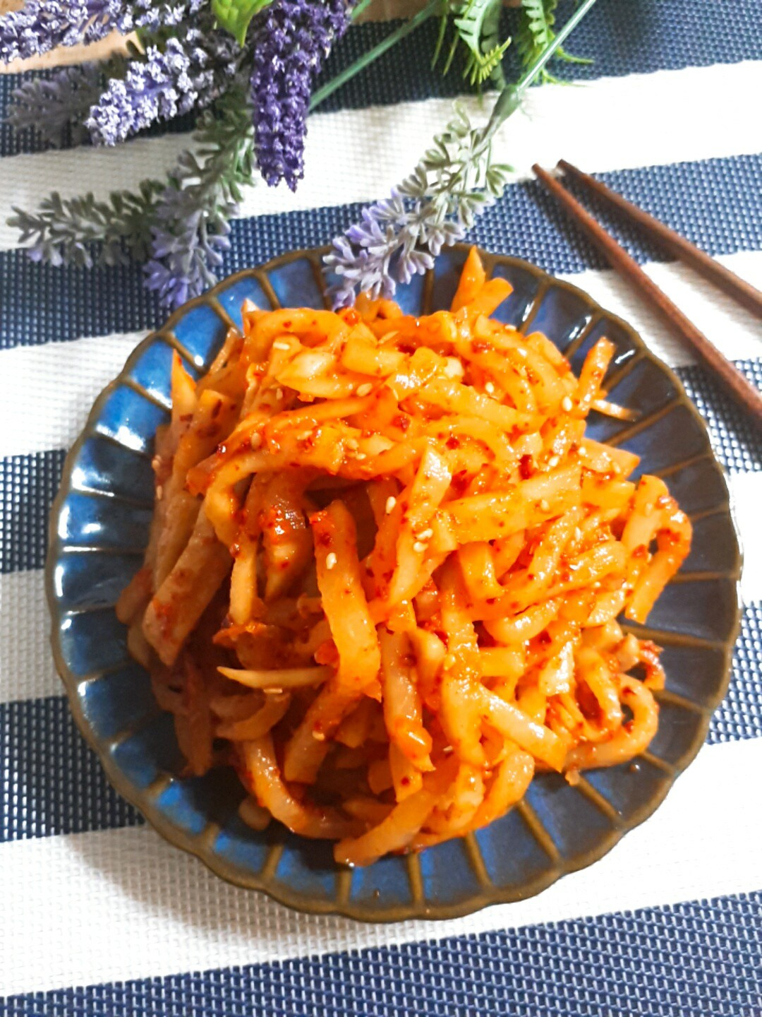 Iris lobak kimchi atau lobak asin menjadi bentuk korek api, dengan ketebalan sekitar 0.3 cm. Hindari mengiris terlalu tipis, karena ini dapat menghasilkan tekstur yang lembek. Usahakan ketebalan yang konsisten untuk gigitan terbaik.