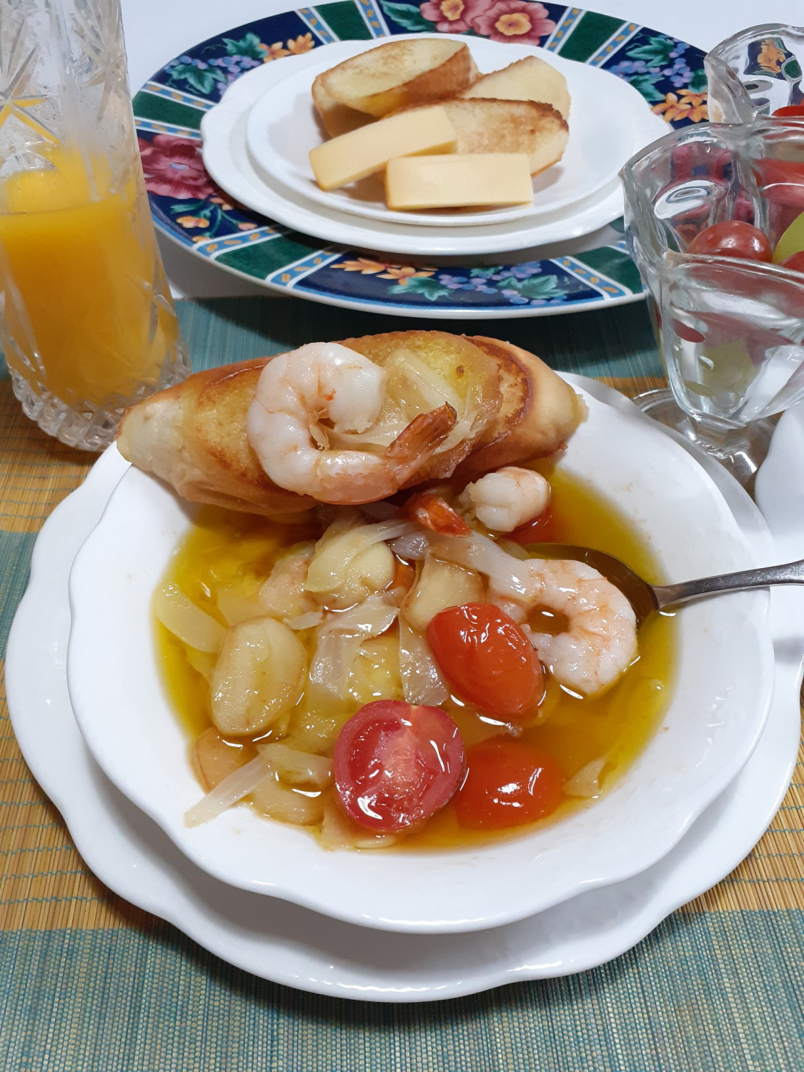 Hidangan khas Spanyol! Kami mengambil udang dan bawang putih, mencelupkan roti, bahkan menghabiskan sisa minyak zaitunnya – saking enaknya!