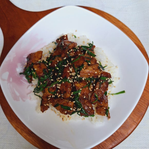 Nasi Campur Gurih dengan Daging Babi Samgyeopsal dan Daun Kucai Melimpah