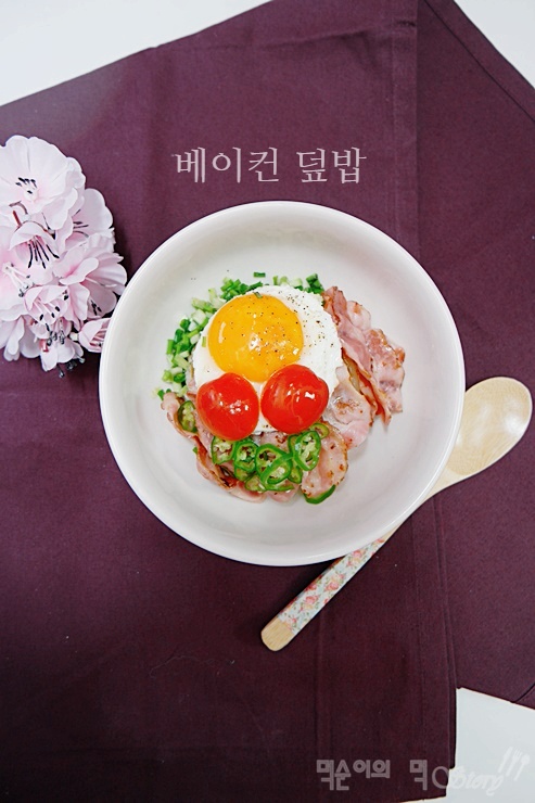 Sekarang, mari kita susun nasi goreng bacon Anda yang indah! Taruh nasi hangat di mangkuk saji. Siramkan saus bawang bombay yang kental secara merata di atas nasi. Tata irisan bacon renyah di atasnya, diikuti dengan irisan daun bawang dan irisan cabai Cheongyang pedas. Terakhir, tambahkan telur mata sapi yang sudah dimasak untuk nasi goreng bacon yang menakjubkan!