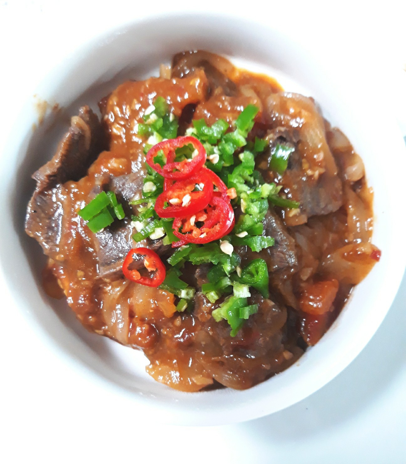 Saya membuat hidangan nasi satu mangkuk yang lezat menggunakan tomat hitam acar dalam sirup plum, yang saya buat kemarin pagi. Menggunakan daging sapi gandik yang rendah lemak membuatnya sangat empuk dan beraroma. Rasanya tidak terlalu menyengat dan memiliki rasa manis yang lembut, menjadikannya pilihan makanan yang aman dan sehat untuk anak-anak. Untuk resep tomat hitam acar dalam sirup plum, silakan lihat @6933730.