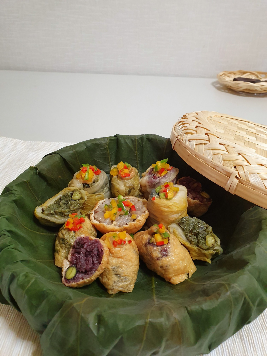 Setelah dikukus, letakkan sesendok saus biji perilla pasta kedelai di atas setiap nasi gulung tiga warna. Hiasi dengan paprika dan cabai cincang halus yang sudah disiapkan. Bekal nasi gulung daun teratai tiga warna Anda yang cerah sudah selesai! Nikmati hidangan yang sehat dan lezat ini.