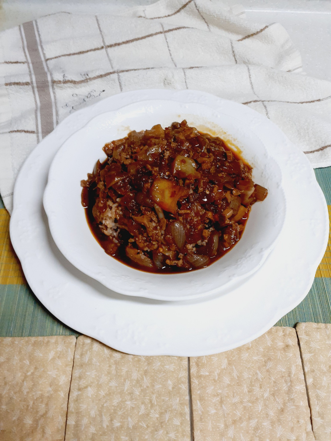 Dalam panci lebar, panaskan 2 sendok makan minyak goreng. Masukkan kentang, bawang bombay, kol, wortel, dan daging sapi cincang yang sudah dipotong. Tumis dengan api besar, aduk terus dengan spatula untuk mencegah gosong, hingga sayuran lunak dan daging matang.