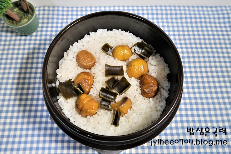 Dalam ttukbaegi (panci tanah liat Korea), pertama masukkan beras yang sudah dicuci dan direndam. Kemudian, letakkan kastanye segar yang sudah disiapkan dan rumput laut yang dipotong dadu di atasnya. Tuangkan air. Karena kastanye akan melepaskan kelembapannya sendiri saat dimasak, penting untuk menggunakan air sedikit lebih sedikit dari biasanya. Ini mencegah nasi menjadi terlalu lembek dan memastikan konsistensi yang sempurna.