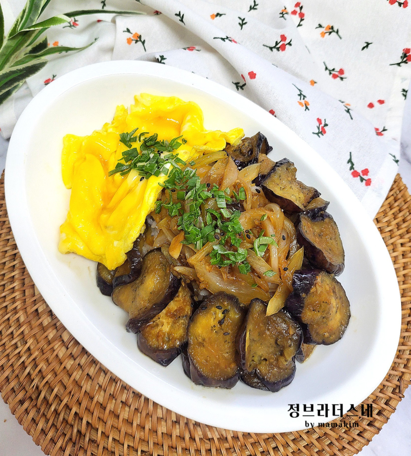 Tata tumisan terong dan bawang bombay yang lezat di atas nasi. Warna ungu terong dan kilau sausnya terlihat sangat menggugah selera.