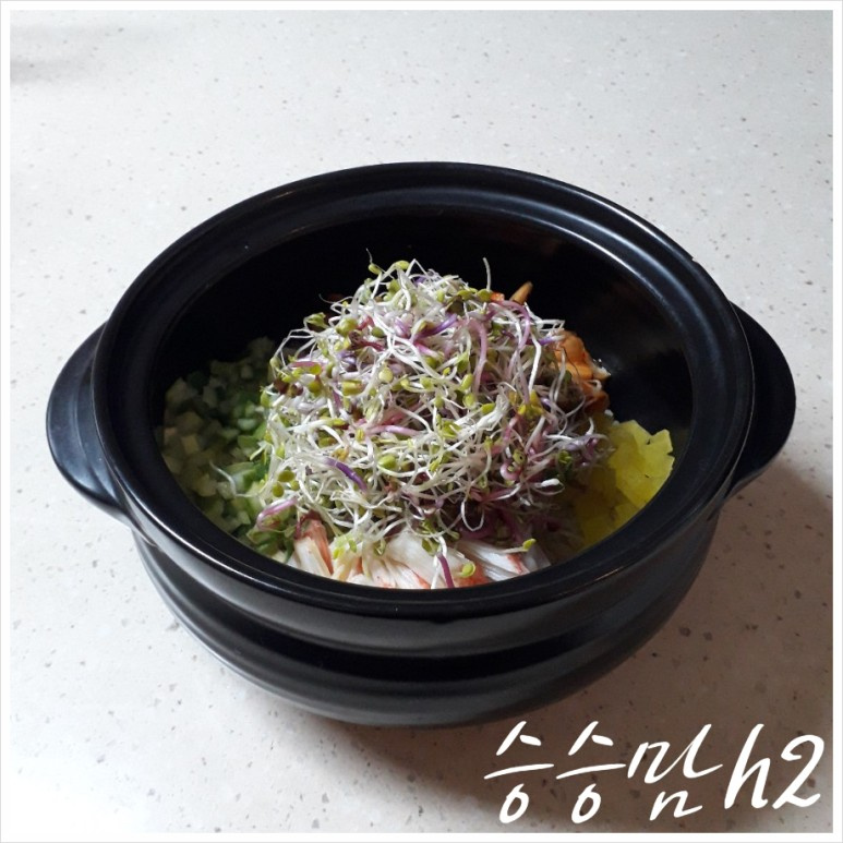 Susun nasi: Ratakan 2 piring nasi hangat di dasar panci tanah liat yang sudah diolesi minyak wijen. Tata di atas nasi cincangan lobak manis, kimchi berbumbu, irisan timun yang sudah diperas, suwiran stik kepiting, dan tobiko yang sudah ditiriskan. Tutup panci dan masak dengan api sedang-kecil selama sekitar 5-7 menit, atau hingga bagian bawah nasi mulai membentuk kerak yang renyah (nurungji). Perhatikan api agar tidak gosong!