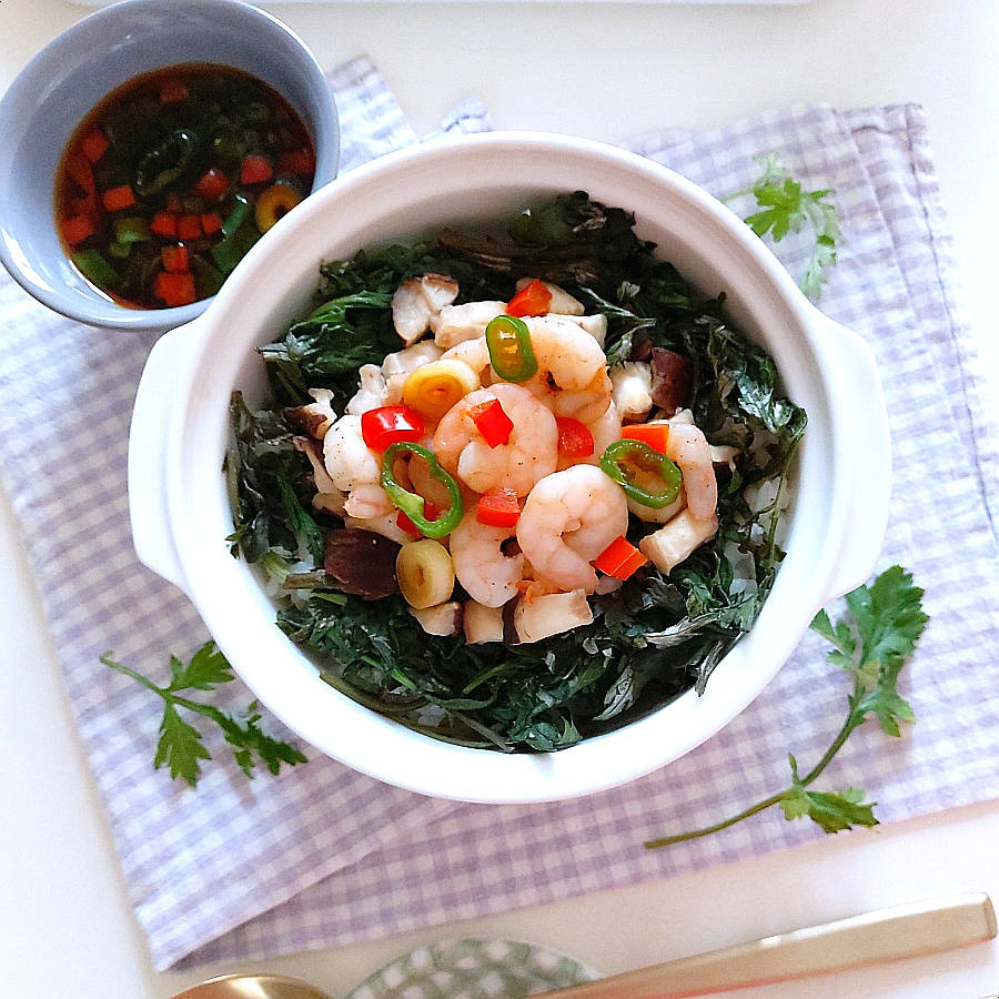 6. Tambahkan Artemisia dan Diamkan: Setelah sekitar 10 menit, ketika Anda bisa mencium aroma nasi yang harum dan udang yang gurih, nasi hampir matang. Sekarang, sebarkan artemisia yang sudah ditiriskan dengan melimpah di atas nasi yang sudah matang. Matikan api, tutup panci, dan biarkan selama 2-3 menit. Periode istirahat ini memungkinkan aroma halus artemisia meresap ke dalam nasi.