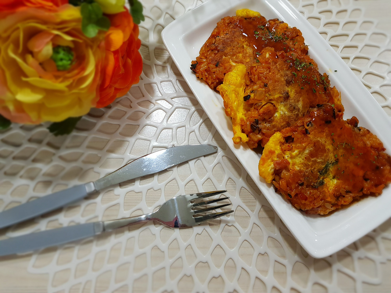Tambahkan minyak secukupnya ke wajan panas. Letakkan adonan nasi goreng yang sudah dibentuk langsung ke dalam wajan. Setelah satu sisi berwarna cokelat keemasan dan mulai renyah, balik perlahan dan tekan kuat dengan spatula, bentuk seperti ho-tteok pipih (panekuk Korea). Untuk mencegah nasi hancur, tuangkan sedikit adonan telur kocok di sekitar tepi adonan nasi agar lebih merekat.