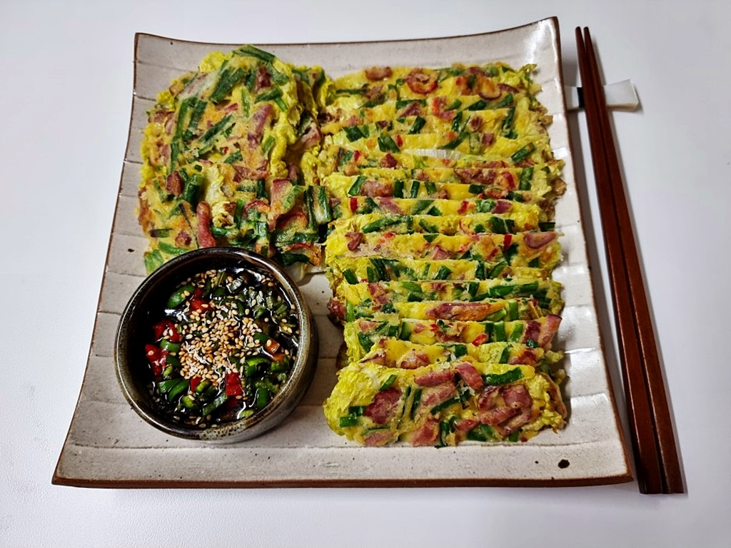 Pertama, potong daging bebek asap bagian paha menjadi potongan seukuran sekali gigit (sekitar 1 cm). Anda bisa memanaskan bebek dalam microwave selama 2 menit untuk menghilangkan kelebihan lemak dengan mudah, membuatnya lebih empuk dan tidak terlalu berminyak. Cincang halus daun bawang segar, cabai hijau Korea, dan cabai merah. Dalam mangkuk, campurkan 7 sendok makan tepung pancake, 3 telur, dan sejumput lada. Aduk rata hingga halus untuk membuat adonan pancake. Cuci bersih lembaran kol Tiongkok yang besar dan tepuk-tepuk hingga kering untuk menghilangkan kelebihan air. Lapisi tipis setiap lembar kol dengan tepung pancake; ini akan membantu adonan menempel dengan indah untuk pancake yang lebih renyah.