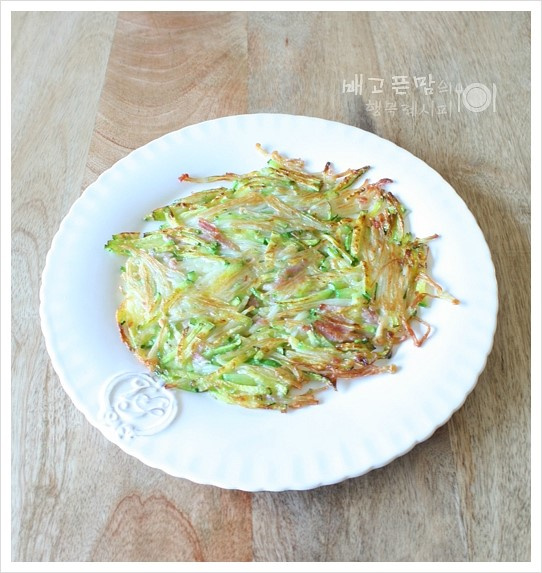 Siapkan satu buah zukini. Menggunakan pisau atau alat pengiris, potong zukini menjadi irisan memanjang (julienne) setipis dan serenyah mungkin. Zukini yang telah diiris ditempatkan dalam mangkuk. Irisan yang tipis menghasilkan tekstur yang lebih baik dan menjadi lebih empuk saat dimasak.
