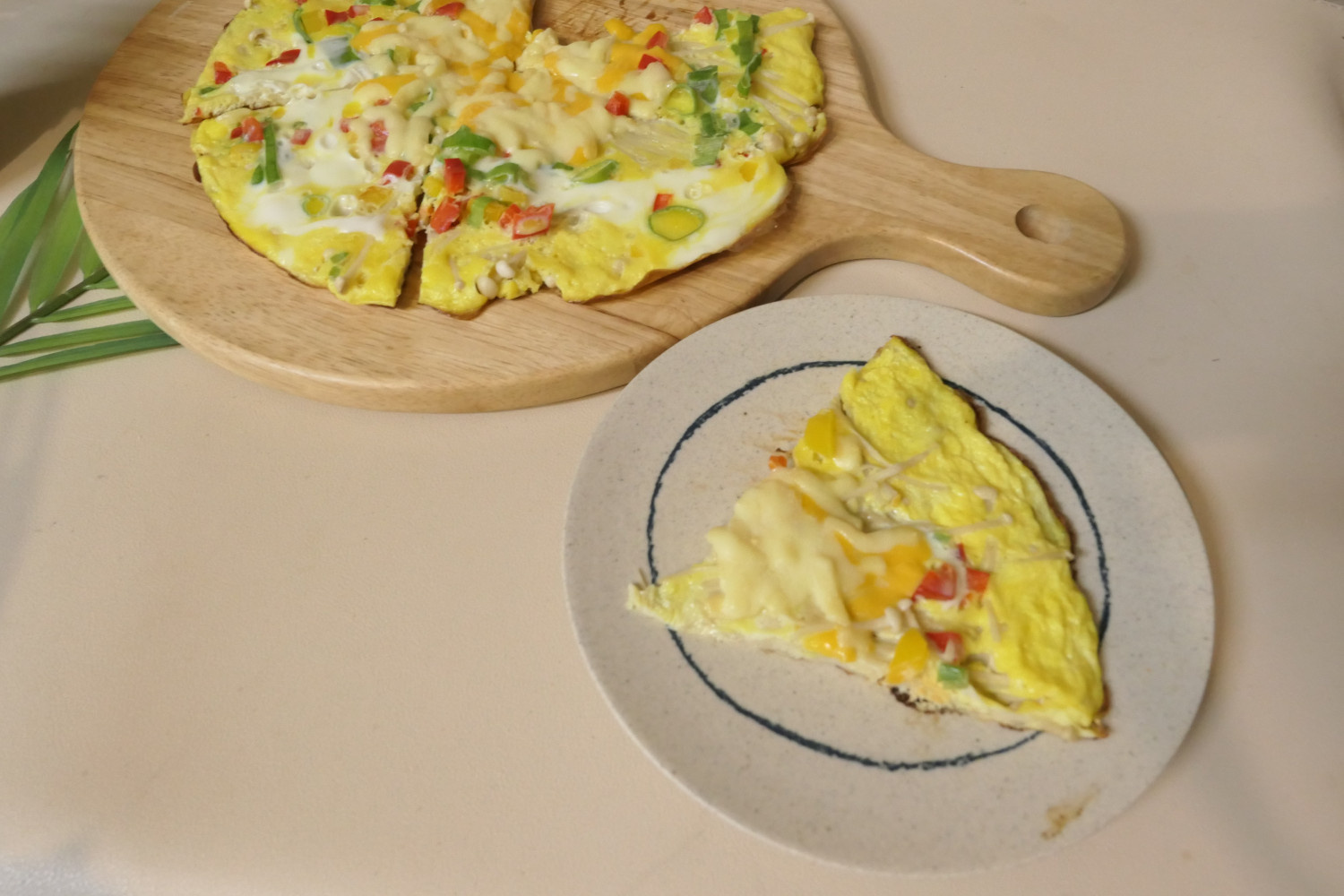 Setelah adonan telur mulai mengeras, goyangkan wajan perlahan untuk memeriksa apakah pizza sudah terlepas dari bagian bawah. Sekarang saatnya menaburkan keju favorit Anda dengan melimpah di atasnya. (Jika Anda membuatnya sebagai camilan rendah kalori, Anda bisa mengatur jumlah keju. Jika Anda ingin menikmati rasa yang lebih kaya, jangan ragu untuk menambahkan banyak keju – menurut saya pribadi, rasanya jauh lebih enak dengan jumlah yang banyak!)