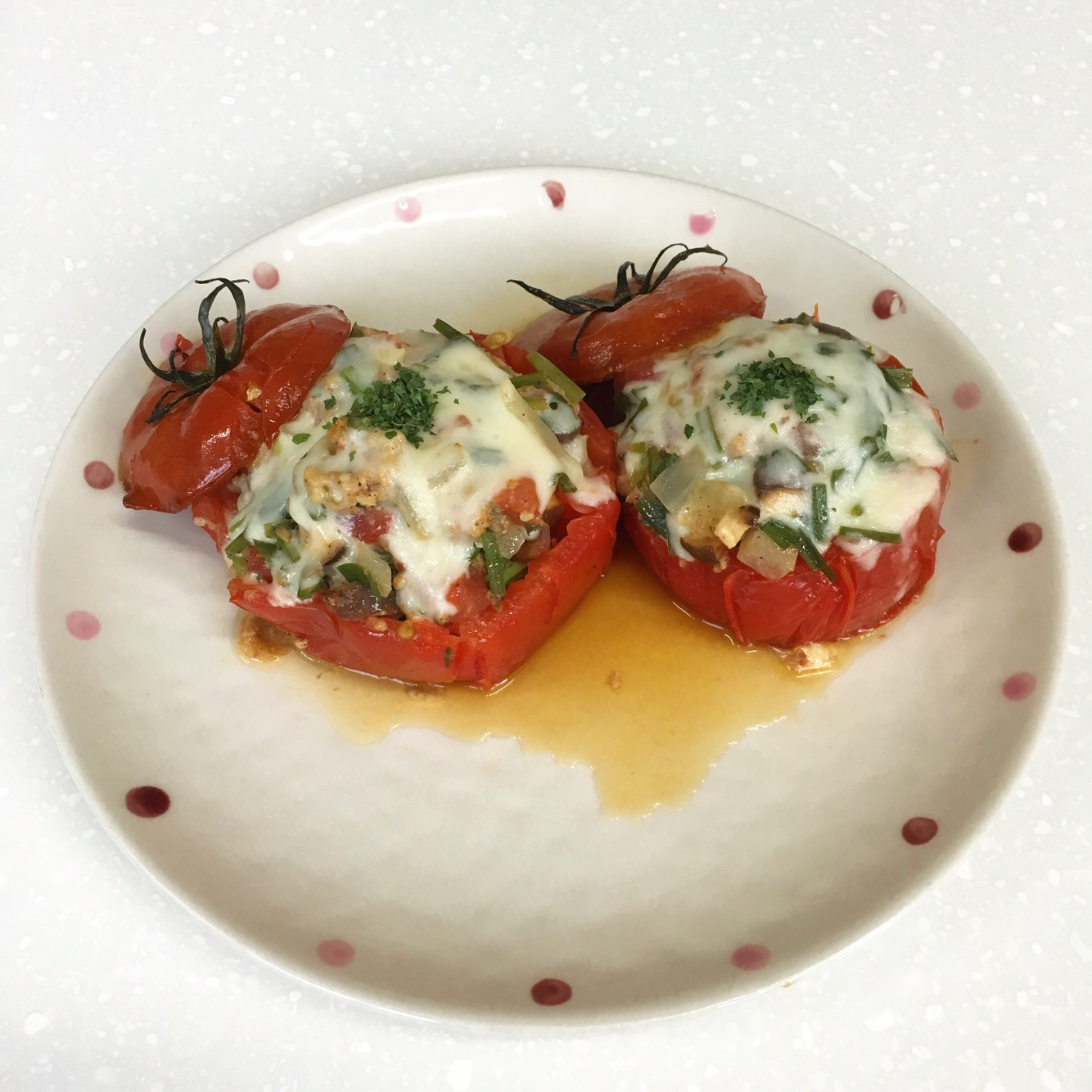 Isi mangkuk tomat yang telah dilubangi dengan isian pangsit yang telah disiapkan, padatkan dengan lembut. Panaskan minyak zaitun secukupnya dalam wajan anti lengket di atas api sedang. Setelah minyak berkilauan, letakkan pangsit tomat yang sudah diisi dengan hati-hati ke dalam wajan.