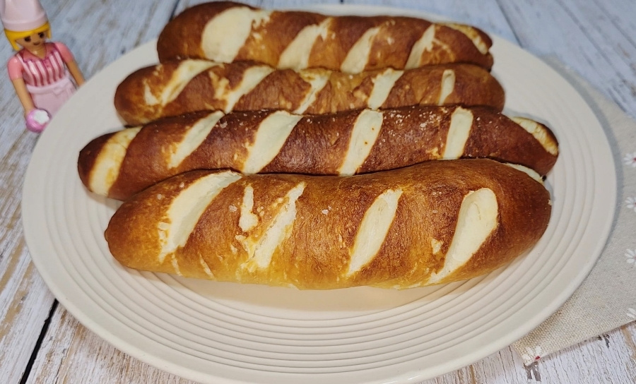 Angkat pretzel yang sudah direbus dengan hati-hati dari air dan letakkan di atas loyang yang dilapisi kertas roti. Sebelum dipanggang, Anda bisa membuat sedikit goresan di bagian atas pretzel dengan pisau tajam untuk memperindah bentuk klasiknya.