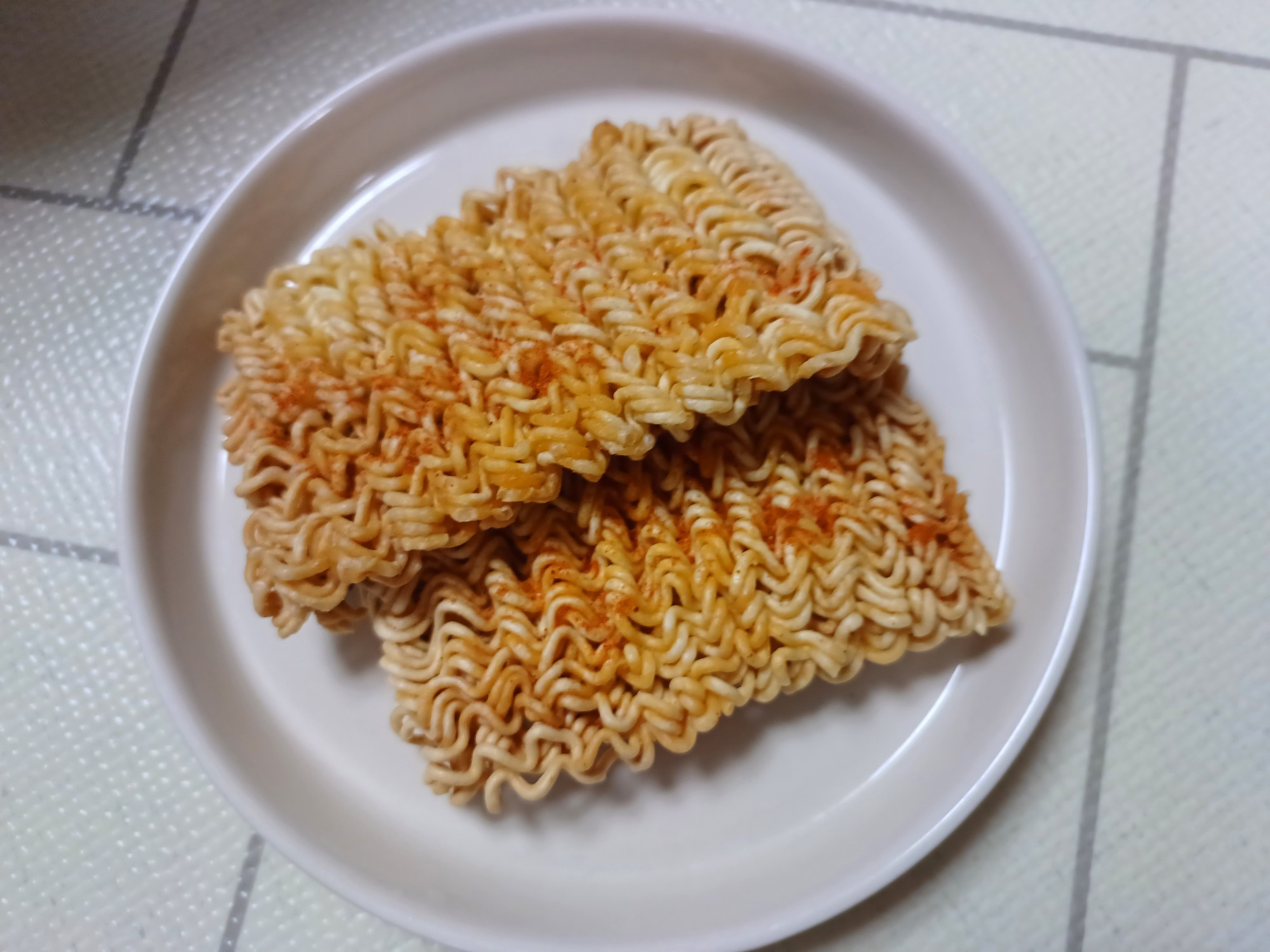 Setelah dikeluarkan dari air fryer, biarkan Ramyeon-ppang sedikit mendingin. Selagi masih hangat tetapi tidak panas, hancurkan menjadi potongan-potongan kecil seukuran sekali gigit. Siap dinikmati! Untuk rasa ekstra, taburkan bubuk bumbu yang tersisa di atas potongan yang sudah dihancurkan. (Foto menunjukkan ramyeon-ppang yang hanya dilapisi mayones dan dipanggang, dengan bubuk bumbu ditaburkan di atasnya setelah dingin.)