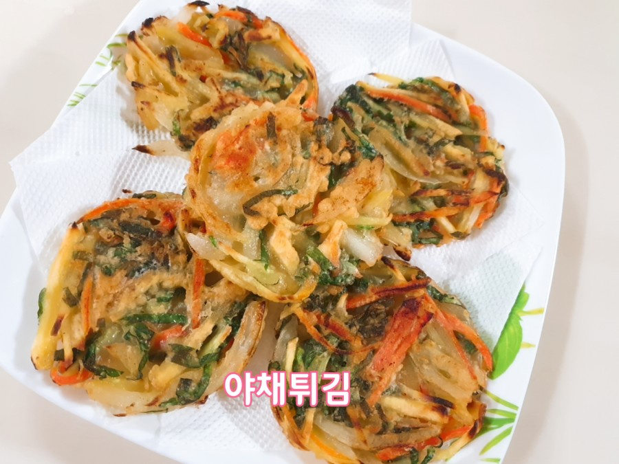 Sekarang, tambahkan sayuran yang sudah disiapkan ke dalam adonan tepung. Mulailah dengan menambahkan ubi jalar, wortel, dan daun perilla yang sudah diiris ke dalam adonan, lalu aduk perlahan. Hati-hati jangan sampai adonan menjadi terlalu encer karena sayuran akan mengeluarkan sedikit air. Aduk perlahan.