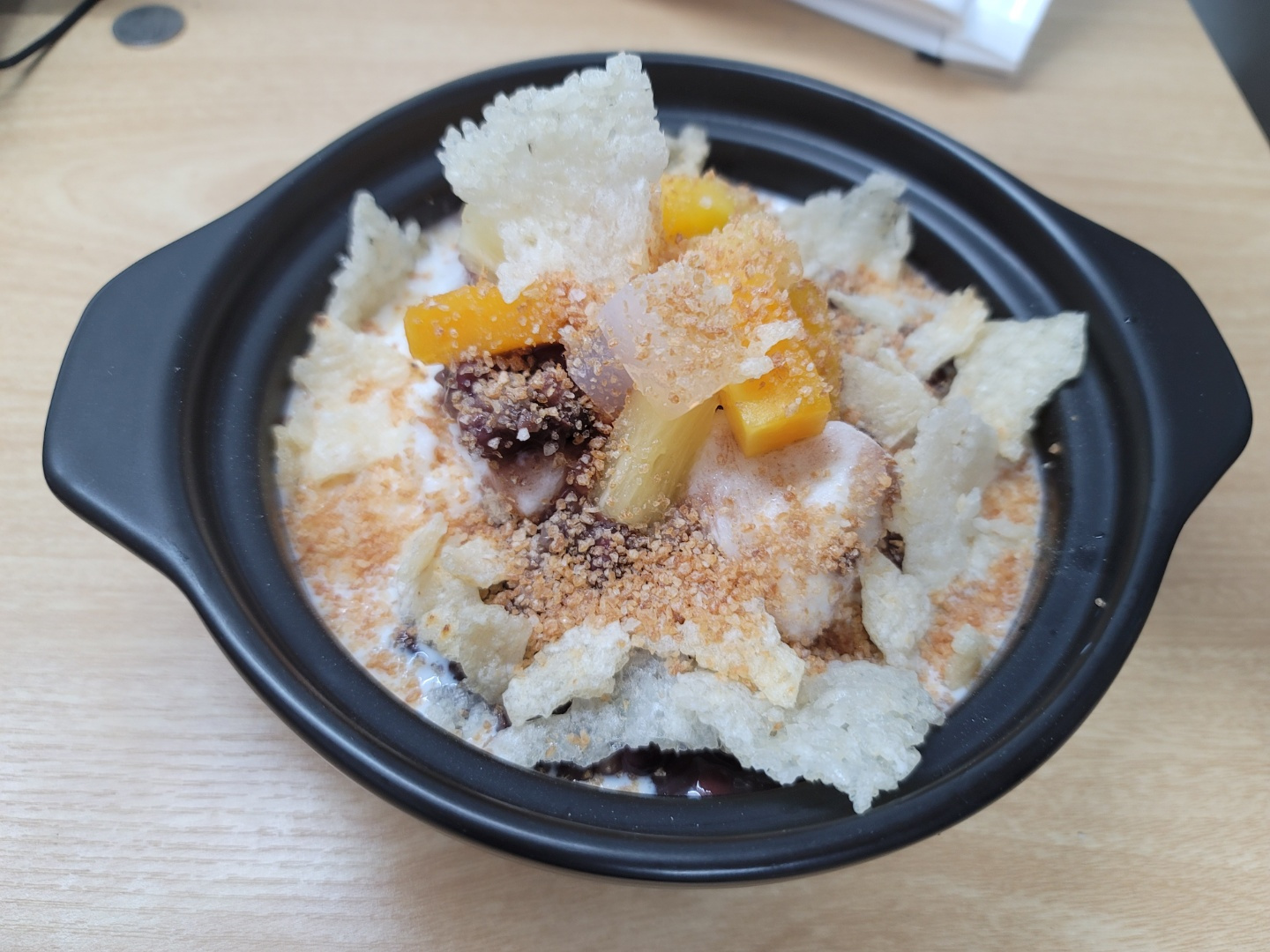 Anda dapat meningkatkan Bingsu Nurungji dasar Anda dengan topping favorit Anda untuk pengalaman yang lebih menyenangkan! Kami telah menambahkan pasta kacang merah manis (pat) dan buah-buahan koktail yang menyegarkan. Sebagai sentuhan dekoratif terakhir, letakkan beberapa potongan Nurungji yang lebih besar di atasnya. ‘Bingsu Nurungji Beras Chamdream’ Anda yang lezat kini siap dinikmati – hidangan penutup buatan sendiri yang istimewa menyaingi kafe mana pun!