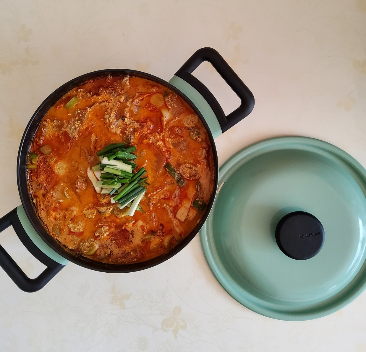 ‘Bjijijigae’ tahu kedelai dengan daging babi yang kaya dan gurih kini siap disajikan! Nikmati hidangan yang lezat dan mengenyangkan ini selagi panas bersama nasi.