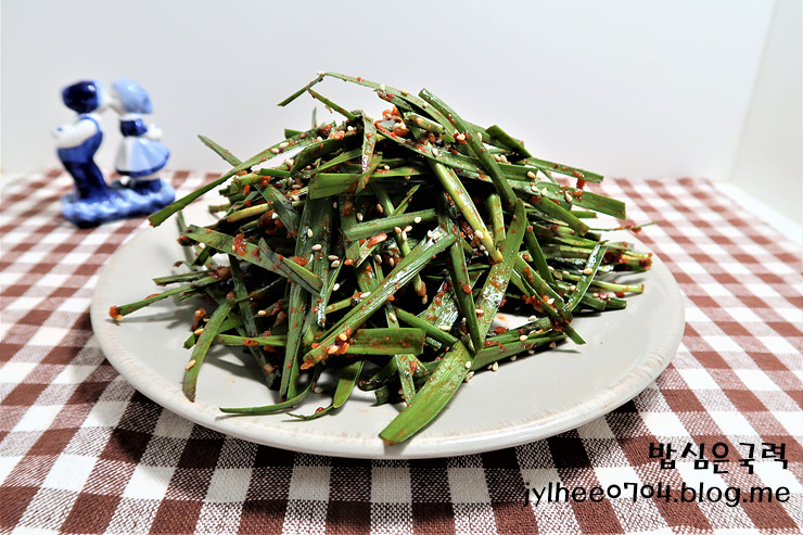 Tips: Saya mengurangi separuh jumlah resep untuk persiapan ini. Saya menggunakan sisa daun kucai dari membuat kimchi mentimun (oi sobagi). Dengan cara ini, Anda bisa menikmatinya dengan segar tanpa membuang bahan.