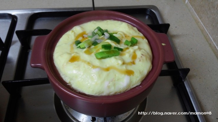 Biarkan matang selama 3-4 menit lagi dengan api kecil. Saat Anda mengangkat tutupnya, gyeranjjim akan mengembang dengan indah, menampilkan tampilan yang luar biasa! Taburkan irisan daun bawang yang sudah diiris tipis secara merata di atas gyeranjjim yang sudah matang. Aroma segar dari daun bawang menambah kelezatannya!