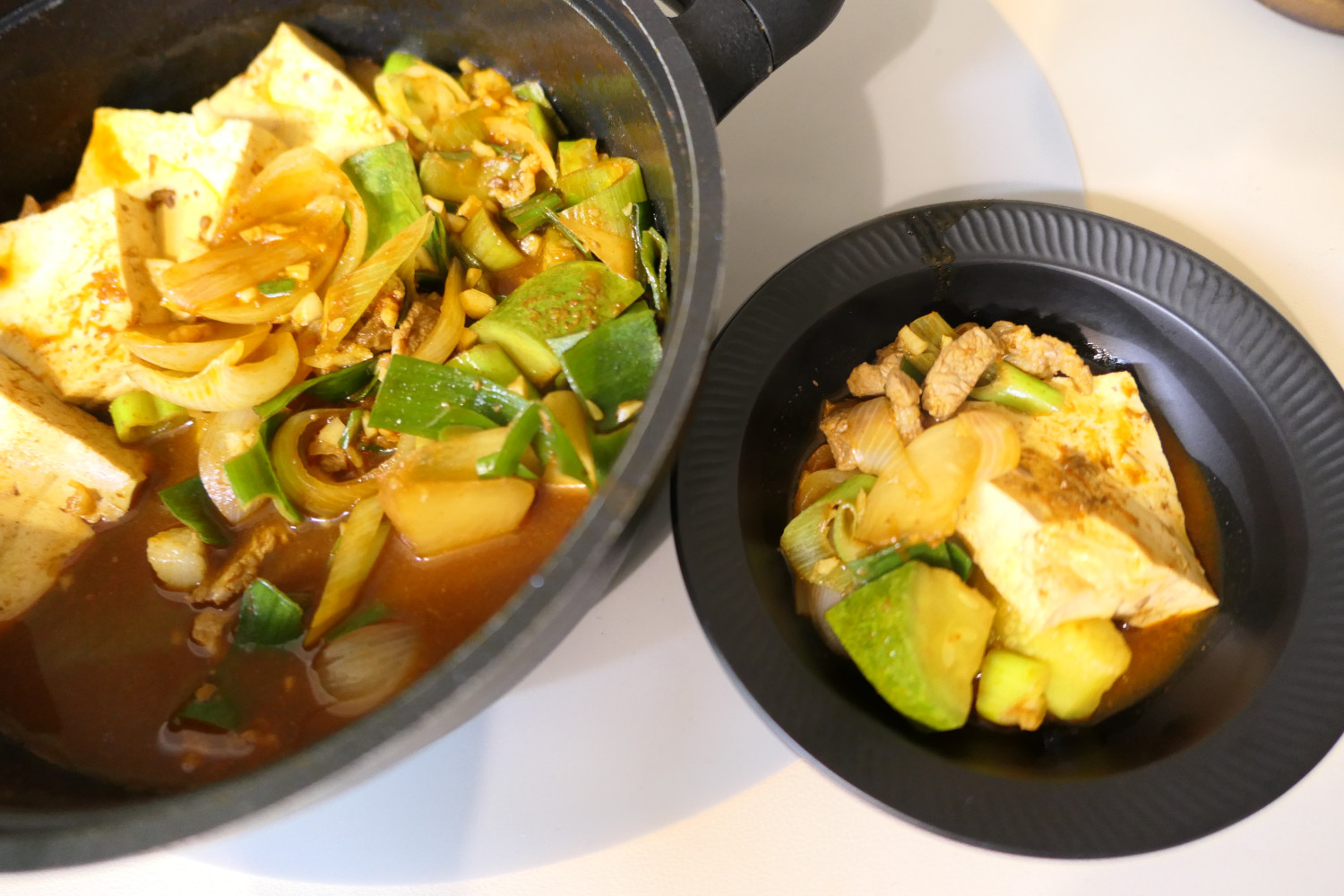 Ketika lobak dan zukini sudah setengah matang, masukkan bawang bombay cincang dan tahu yang sudah dipotong dadu. Terus masak perlahan, siram bahan-bahan dengan kuah saat dimasak. Ini membantu tahu dan sayuran menyerap bumbu secara merata.