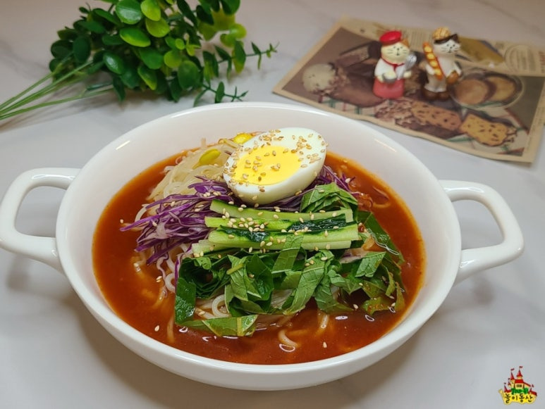 Dan inilah dia, siap disajikan! Tempatkan mie jjolmyeon yang sudah dibilas ke dalam mangkuk saji. Tuangkan kuah bibim dingin dari lemari es secara melimpah di atas mie. Untuk pengalaman yang lebih dingin, Anda bisa menambahkan sedikit kuah naengmyeon yang setengah beku. Beri topping tauge yang sudah disiapkan, irisan kol merah tipis, mentimun iris memanjang, daun perilla segar, dan telur rebus yang dibelah. Taburi dengan biji wijen panggang untuk tampilan yang menarik. Jjolmyeon Naengmyeonmul Bibim Anda yang menyegarkan kini telah selesai!