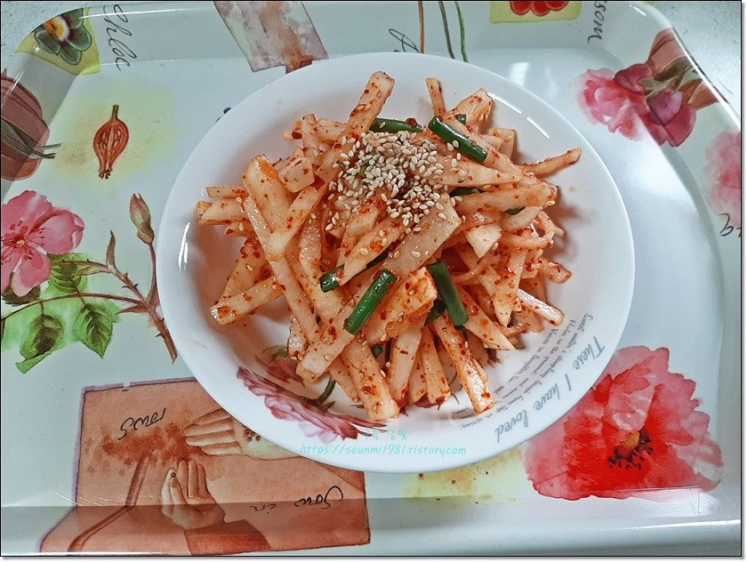 Aduk perlahan lobak agar bubuk cabai tercampur rata. Kemudian, tambahkan kecap ikan dan garam untuk menyesuaikan rasa. Penting untuk menyesuaikan jumlah garam berdasarkan rasa alami lobak dan preferensi pribadi Anda. Musaengchae dapat dinikmati dalam dua cara: pertama, dengan sedikit menggarami lobak untuk mengeluarkan airnya, dan kedua, dengan langsung membumbuinya tanpa digarami terlebih dahulu untuk mempertahankan kerenyahannya. Musaengchae yang dibuat sesaat sebelum dimakan cenderung cepat layu, jadi membumbuinya langsung memberikan rasa yang segar dan lezat.