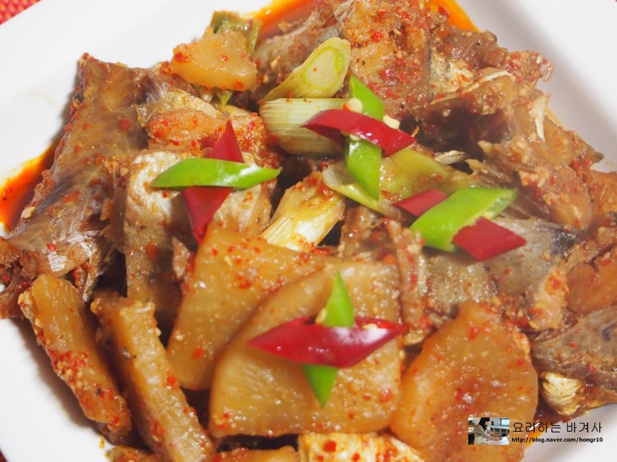 Terakhir, tambahkan irisan cabai merah dan hijau untuk warna yang cantik dan sedikit rasa pedas. Anda bisa mengirisnya serong atau membelahnya setelah membuang bijinya. Saya biasanya memperkirakan waktu memasak dengan melihat lobak yang menjadi transparan. Setelah ikan pollack matang, lobak empuk, dan kuah mengental sesuai selera Anda, Kodari Jorim lezat Anda siap disajikan!