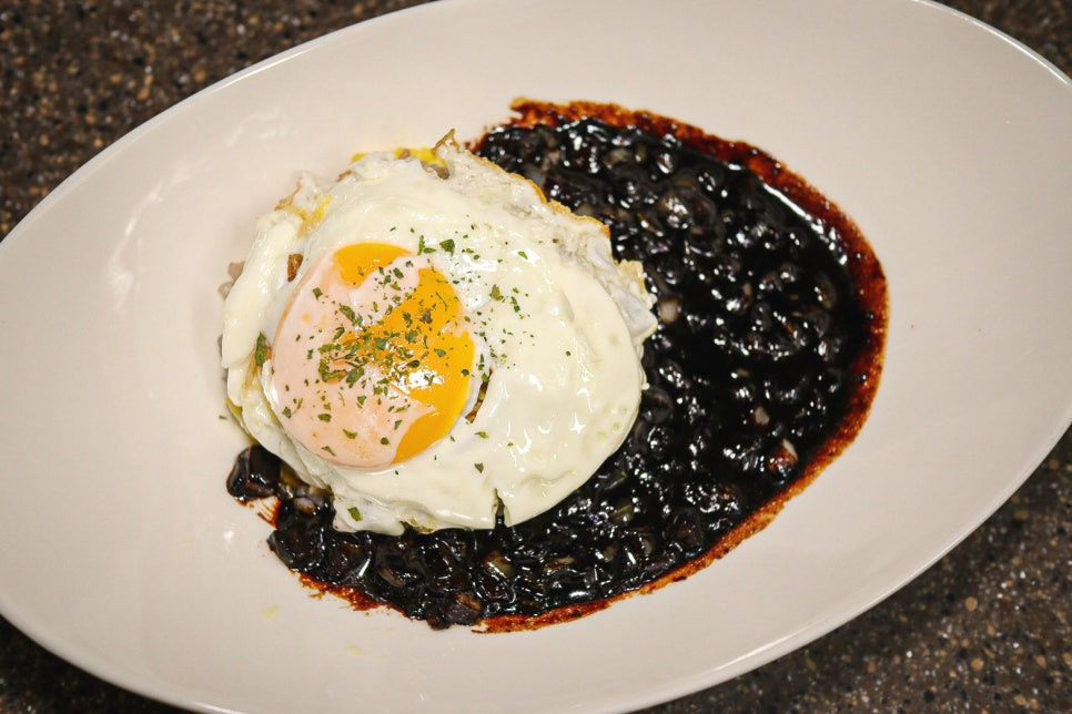 Sekarang, mari kita tata semua bahan dengan indah! Letakkan nasi goreng yang sudah dibentuk di piring saji. Tambahkan telur mata sapi hangat yang baru saja digoreng di atasnya. Terakhir, tuangkan saus Jjajang lezat secara melimpah…