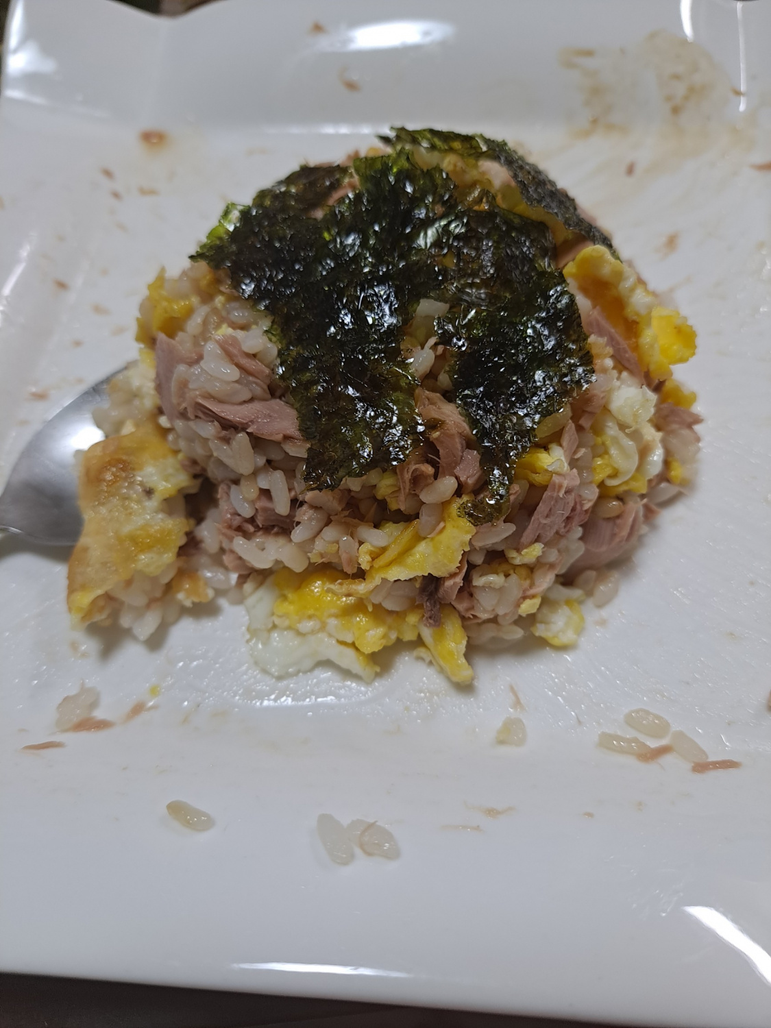 Terakhir, untuk menambah cita rasa, taburkan rumput laut cincang atau serpihan rumput laut berbumbu di atas nasi goreng. Aduk perlahan sekali lagi. Nasi goreng telur orak-arik kecap tuna lezat Anda siap dinikmati selagi hangat!