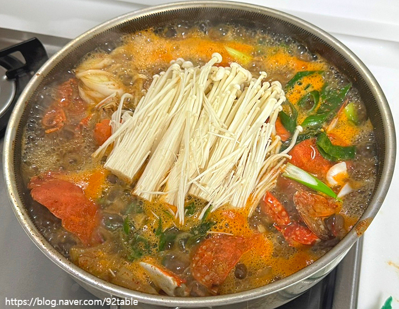 Terakhir, tambahkan 1/2 daun bawang, daun perilla atau ketumbar, 1 cabai Cheongyang untuk sentuhan pedas, dan 1 jamur enoki. Biarkan mendidih selama kurang lebih 30 detik lagi, dan sup kepiting lezat Anda siap!