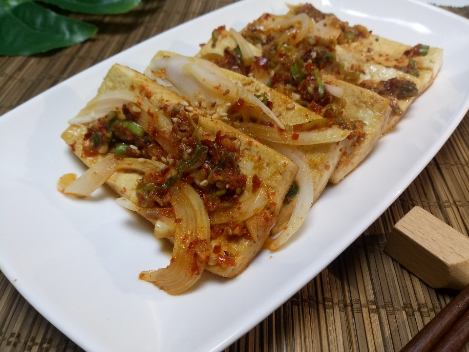 Setelah tahu berwarna cokelat keemasan di kedua sisinya, susun irisan bawang bombay secara merata di atas tahu. Ini akan membantu bawang bombay matang perlahan saat dimasak dan mengeluarkan rasa manisnya ke dalam saus.