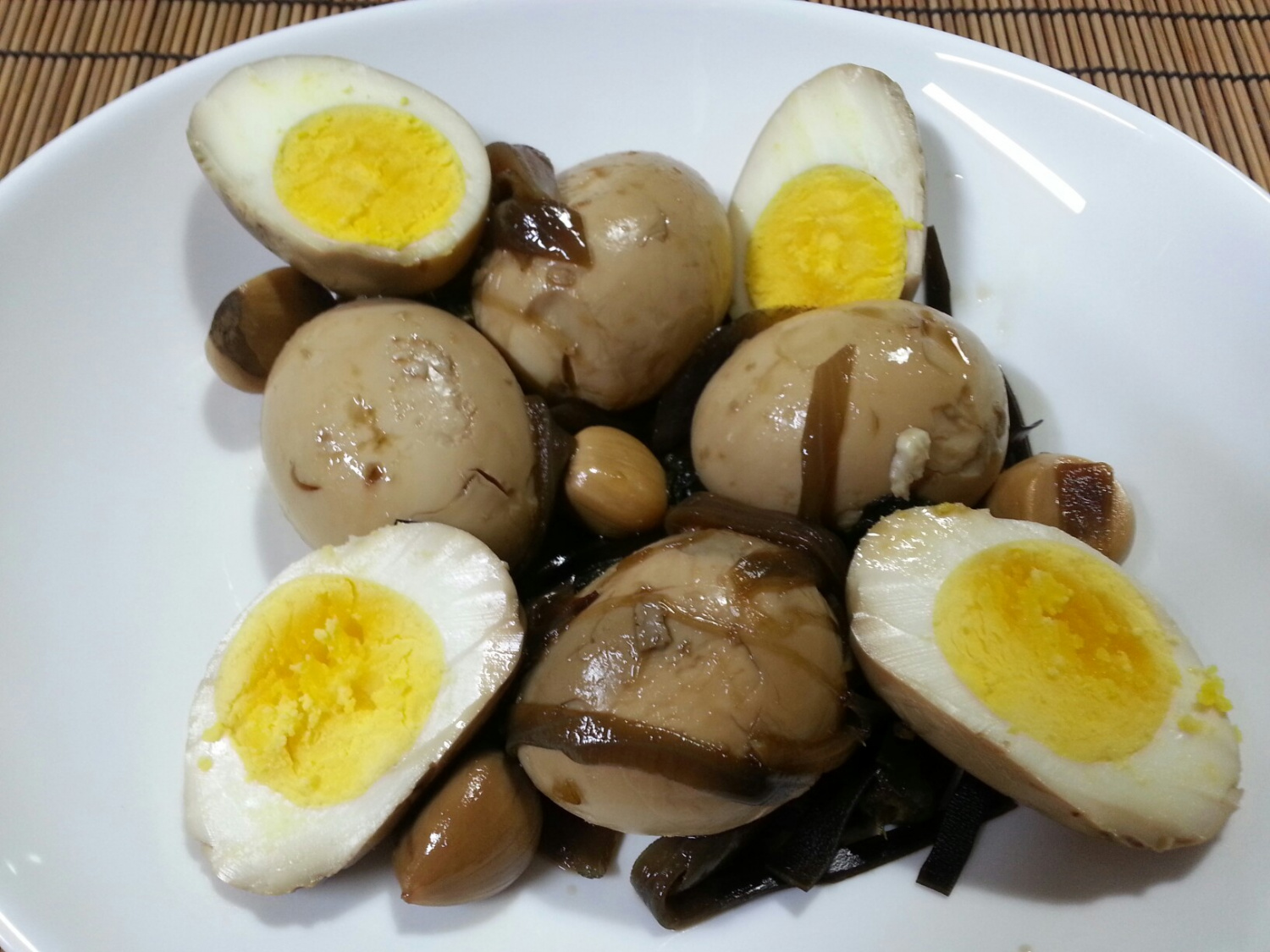 Dalam panci terpisah, tuangkan sekitar 1.5 cangkir air (ukuran cangkir kertas) dan tambahkan potongan kombu untuk direbus. Setelah air mulai mendidih, angkat kombu. Kupas semua telur rebus dengan hati-hati. Sisihkan telur yang sudah dikupas.