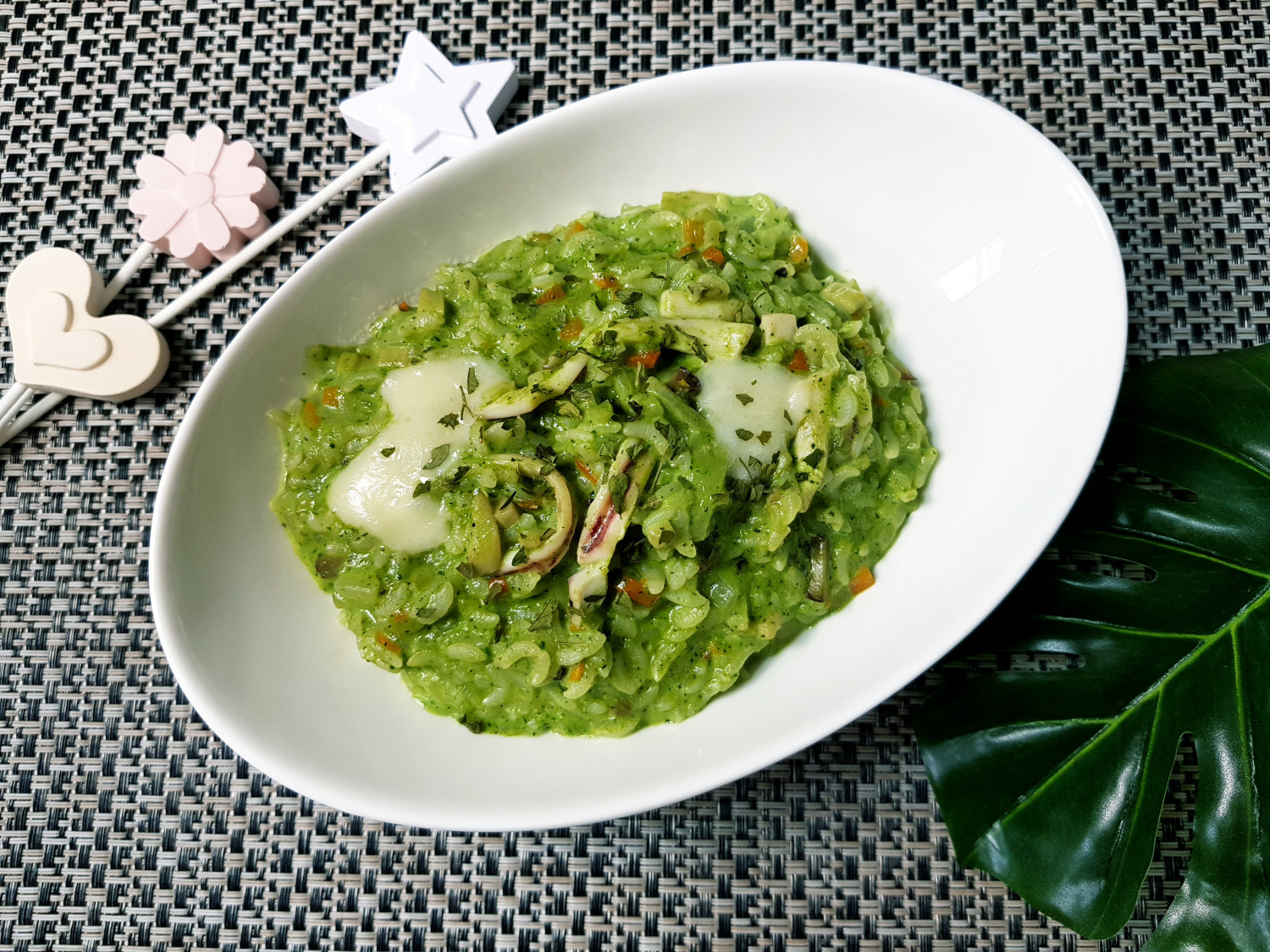 Risotto Cumi Bayam hijau cerah Anda siap! Meskipun warnanya mungkin terlihat tidak biasa, rasa gurihnya yang ringan dan nutrisinya yang melimpah benar-benar lezat. Sangat direkomendasikan untuk orang dewasa dan sempurna juga sebagai makanan bayi, jadi pastikan untuk mencobanya!