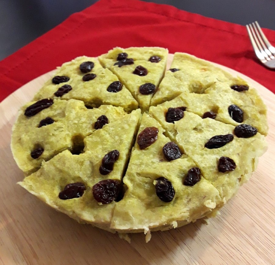 Siapkan wadah yang aman untuk microwave, lalu ratakan adonan ubi jalar di dasarnya. Taburkan kismis di atasnya. Alternatifnya, Anda bisa mencampurkan kismis langsung ke dalam adonan ubi jalar sebelum dituang.