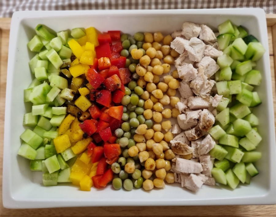 Tata chickpeas dan kacang polong yang sudah direbus di atas piring atau mangkuk besar secara menarik. Di sebelahnya, susun sayuran dan dada ayam yang sudah dipotong dadu berbaris rapi, pisahkan berdasarkan warna. Lihat betapa cerah dan menggugahnya warna-warnanya! Menyusunnya berdasarkan warna membuatnya terlihat semakin lezat.