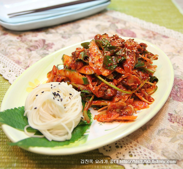 Cumi-cumi sedang musimnya, dan sangat lezat jika direbus lalu disajikan dengan saus gurih. Hari ini, kita akan mengambil cumi-cumi rebus tersebut dan mencampurnya dengan berbagai sayuran segar untuk menciptakan salad cumi-cumi dan sayuran yang cerah, manis, dan asam. Mungkin karena kita menggunakan cumi-cumi segar, rasanya begitu luar biasa, akan membuat salad siput kalengan mana pun terlihat membosankan dibandingkan! Sumber: http://hls3790.tistory.com/1050?category=204690 [Masakan Kim Jin-ok Enak]