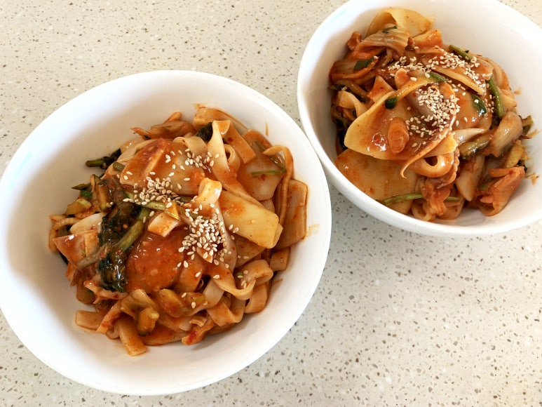 Beberapa waktu lalu saya membuat salad cumi dengan bumbu pedas (ojingeo cho muchim) dan menyisakan sedikit. Awalnya, saya berencana menambahkan mie ke sisa salad cumi tersebut untuk membuat bibim guksu (mie campur pedas) sederhana. Namun, karena jumlahnya sedikit, saya memutuskan untuk menambahkan ‘eolgal kimchi’ (kimchi sawi putih muda) dan membuat ‘Kimchi Bibim Kaljebi’. Kaljebi adalah hidangan yang menggabungkan kalguksu (mie potong pisau buatan tangan) dan sujebi (potongan adonan tarik tangan). Hidangan ini adalah Kimchi Bibim Kaljebi pedas dan asam yang terbuat dari salad cumi berbumbu, benar-benar menggugah selera! Wah, nama yang panjang sekali ya! Haha, tapi rasanya luar biasa!