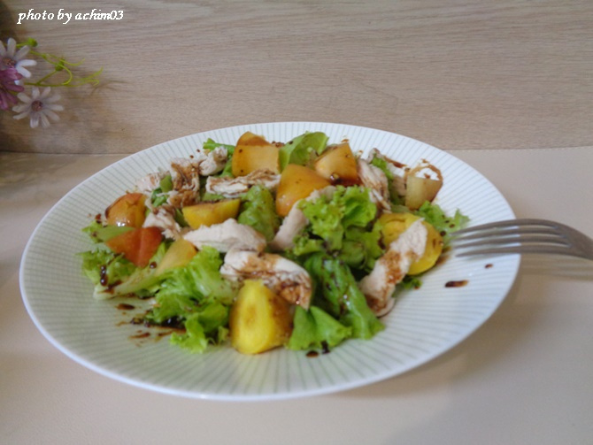 Tata sayuran salad segar di atas piring besar secara menarik. Tambahkan ubi jalar kukus dan buah musiman segar (dalam resep ini kami menggunakan plum, tetapi buah apa pun yang Anda suka akan sempurna!). Tambahkan dada ayam suwir yang sudah dingin dengan melimpah untuk melengkapi salad dada ayam Anda yang mengesankan. Menggunakan ubi jalar yang dikukus bersama nasi membuat persiapan menjadi lebih mudah. Terakhir, sebelum disajikan, tuangkan saus yang sudah disiapkan secara merata di atas salad dan aduk rata. Nikmati hidangan sehat dan lezat Anda!
