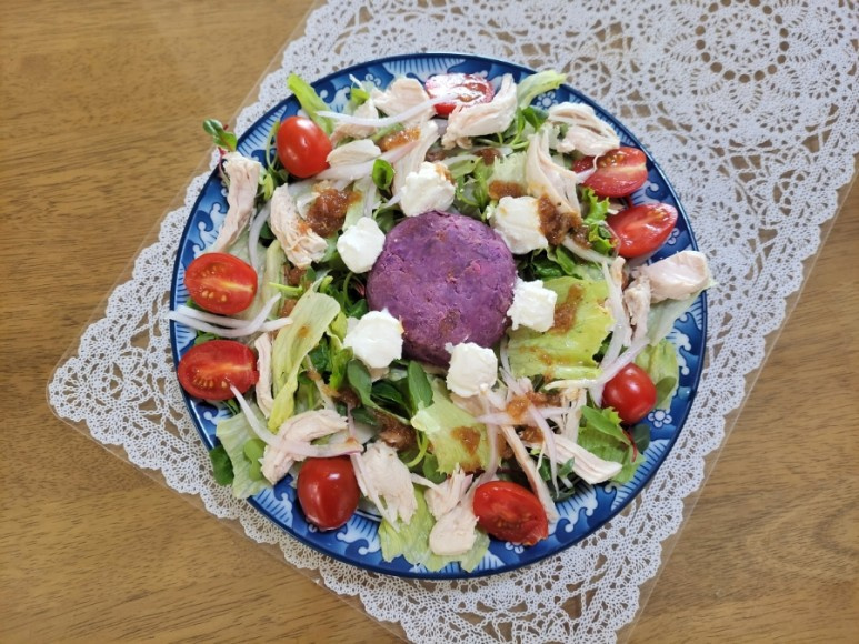 Selanjutnya, siapkan dasar yang lezat untuk salad Anda: ubi ungu. Ubi ungu kukus lebih baik dihaluskan selagi masih hangat untuk mendapatkan konsistensi yang lebih lembut. Letakkan dalam mangkuk dan haluskan sepenuhnya dengan garpu atau penumbuk kentang.