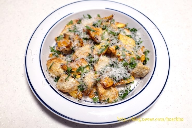 Cincang halus peterseli Italia dan taburkan secara merata di atas labu dan talas hangat di piring. Aromanya yang halus akan sangat menyenangkan.