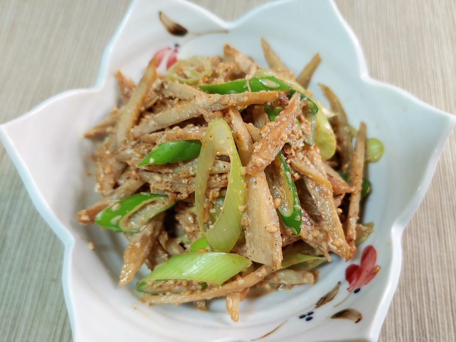 Kami telah mengubah akar ubi jalar, dengan teksturnya yang renyah, menjadi salad lezat mirip salad akar teratai, dibumbui dengan wijen gurih dan mayones kental. Ini adalah lauk yang sempurna untuk nasi atau salad ringan dan menyegarkan.