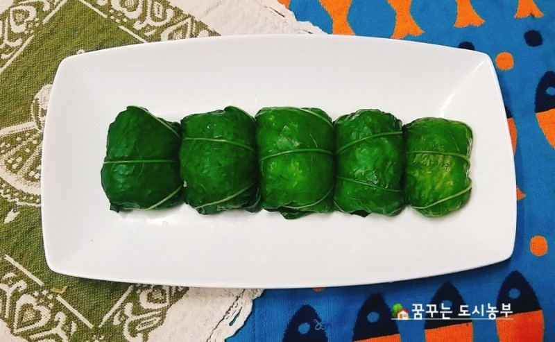 Lipat tepi atas daun kembang abjad ke bawah untuk menyelesaikan gulungan. Tekan lembut seluruh ssam-bap untuk membentuknya dengan rapi dan memastikan ssam-bap tetap menyatu.