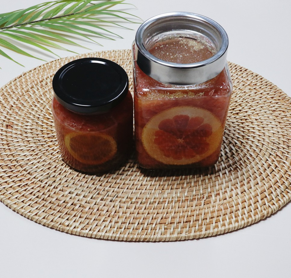 Dengan hati-hati, masukkan campuran jeruk bali dan gula ke dalam toples kaca yang bersih, steril, dan kering. Sebaiknya sisakan sedikit ruang di bagian atas toples.