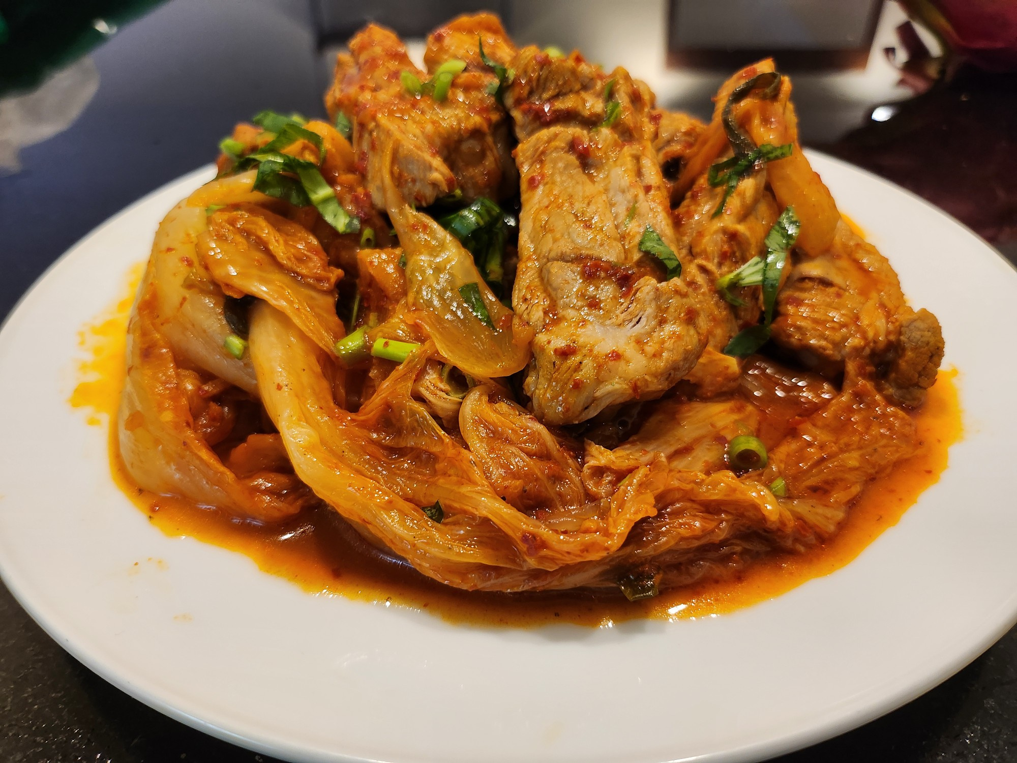 Terakhir, tambahkan kimchi yang sudah dipotong-potong (sekitar 1/4 bonggol) di atas tulang punggung babi. Saat kimchi matang, ia akan menyatu dengan tulang punggung babi, menciptakan kedalaman rasa yang luar biasa.