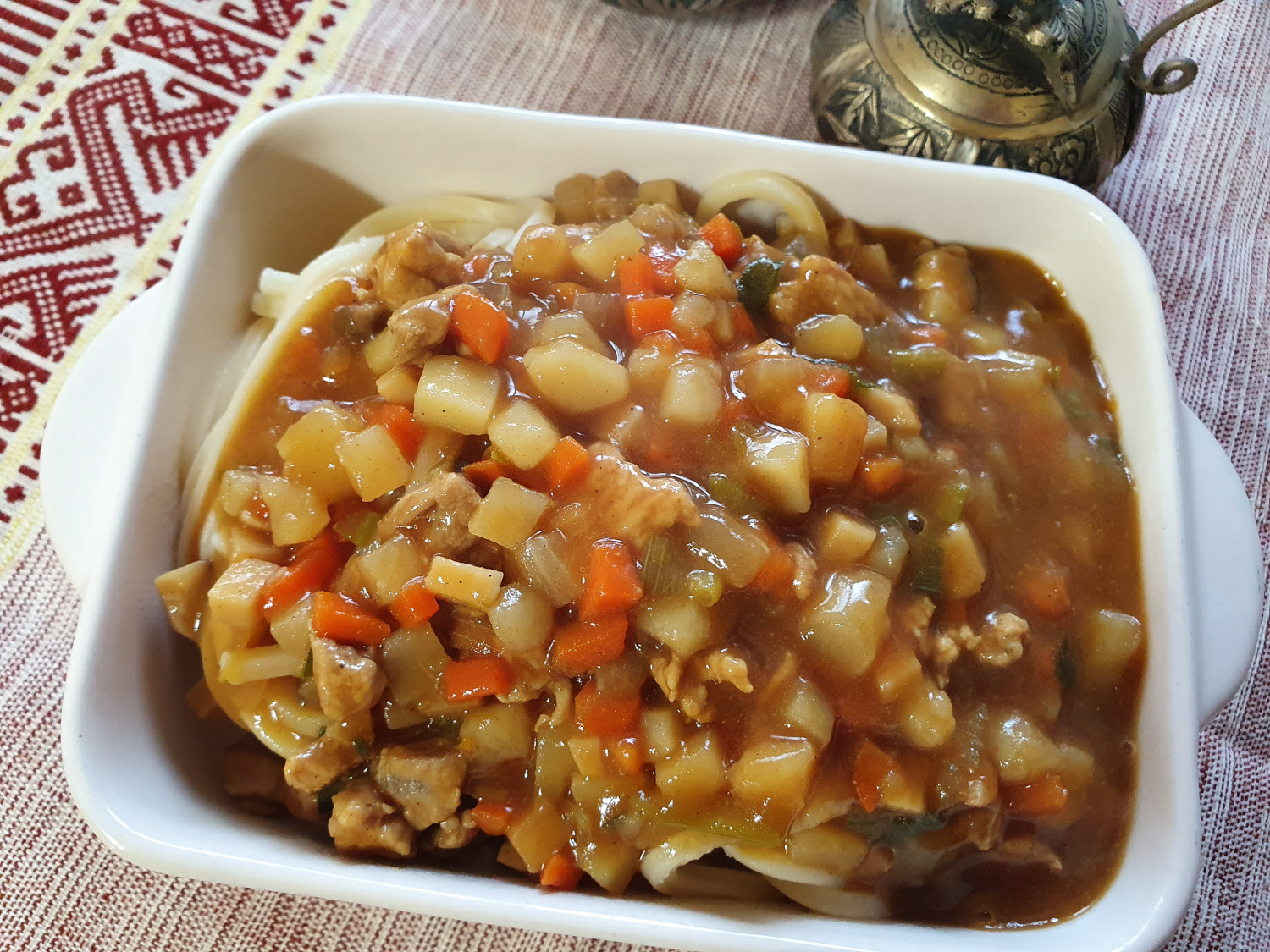Siramkan saus kari hangat yang melimpah di atas mi pasta. Pastikan saus kari yang kental melapisi mi dengan baik.
