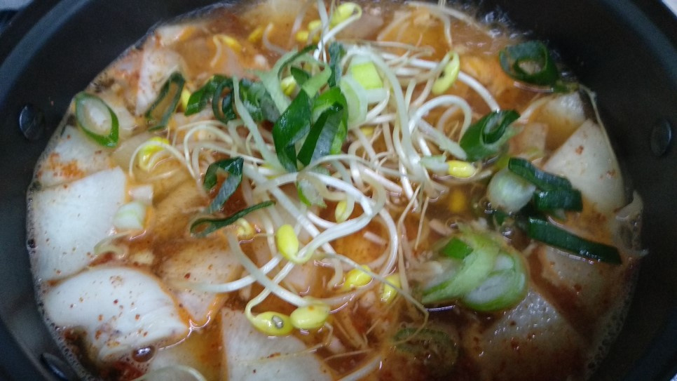 Tuang 600 ml air ke dalam panci. Masukkan lobak Korea yang sudah dikupas dan diiris tipis (gaya na-bak). Didihkan dengan api besar dan masak hingga pinggiran lobak mulai terlihat transparan.