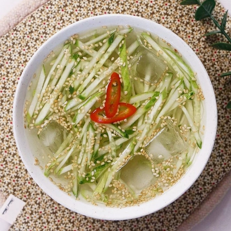 Sup Dingin Timun Korea (Oi Naengguk) Anda yang menyegarkan siap disajikan! Rasanya asam manis dengan tekstur timun yang renyah. Meskipun lezat disajikan segera, mendinginkannya di lemari es akan meningkatkan kesegarannya. Sangat cocok dinikmati di hari yang panas!