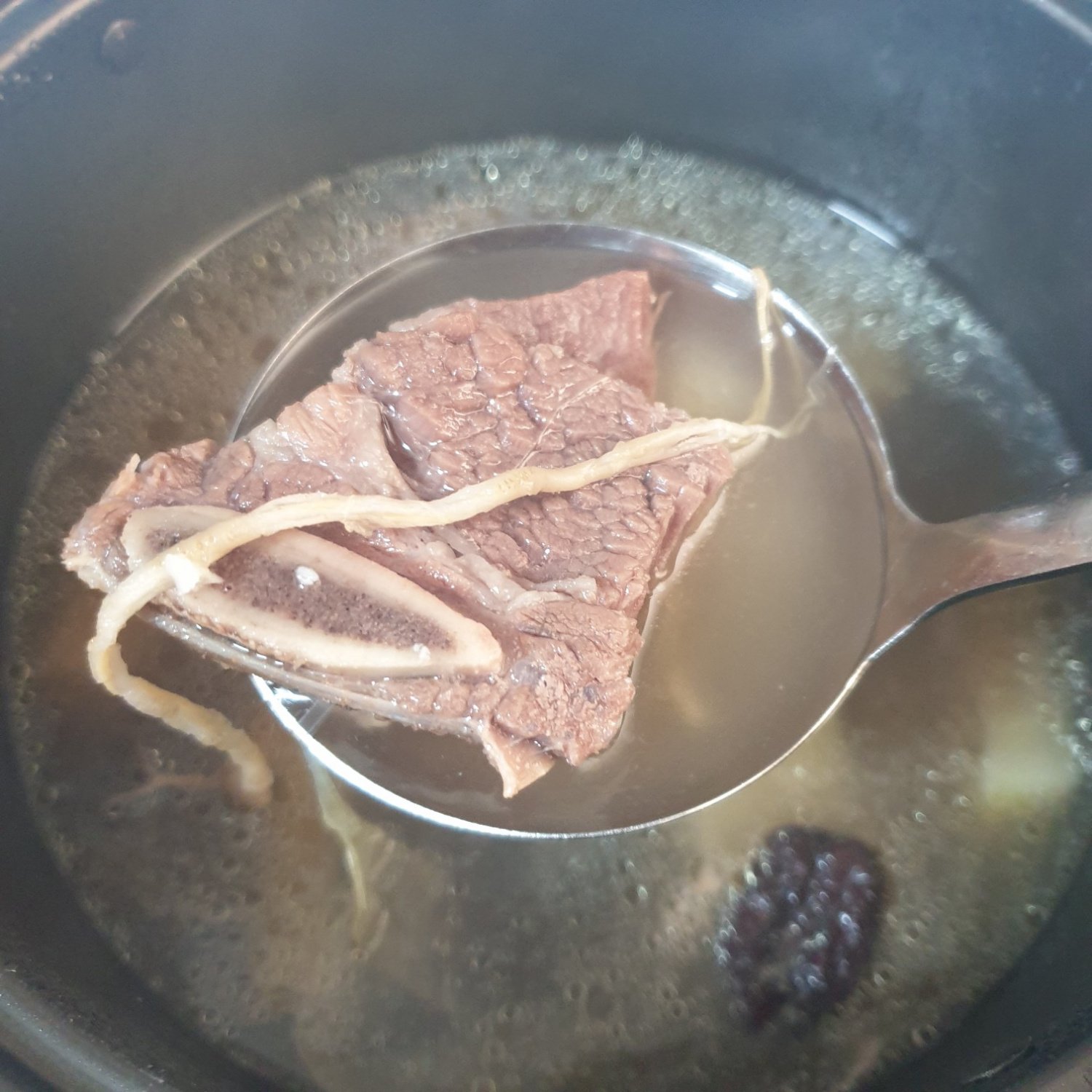 Setelah mendidih selama satu jam, segera angkat rumput laut kering. Memasak rumput laut terlalu lama dapat melepaskan zat lengket yang membuat kaldu keruh dan merusak rasanya. Setelah rumput laut diangkat, didihkan kembali sup dan lanjutkan memasak selama 30 menit lagi, atau hingga iga sapi menjadi sangat empuk dan mudah lepas dari tulang.